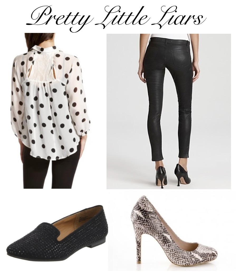 Since I’ve finally admitted to my out-of-control TV habit, I’ve decided to continue sharing these outfits with you as I’m always seeing cute looks on the shows I watch! I loved this simple and easy look that Spencer wore in the ABC Family show, Pretty Little Liars. First of all, I’m such a sucker for a polka dot print and this blouse is very on-trend with it’s high-low hem and cut-out details in the back. Then, to add a little more interest to the look, I chose these coated black jeans, although you could just as easily wear black pants or jeggings. Lastly, you choose the footwear: these awesome studded loafers (which I own!) if you want to keep it more casual, or you can be a bit bold and daring by mixing prints with these snakeskin pumps!