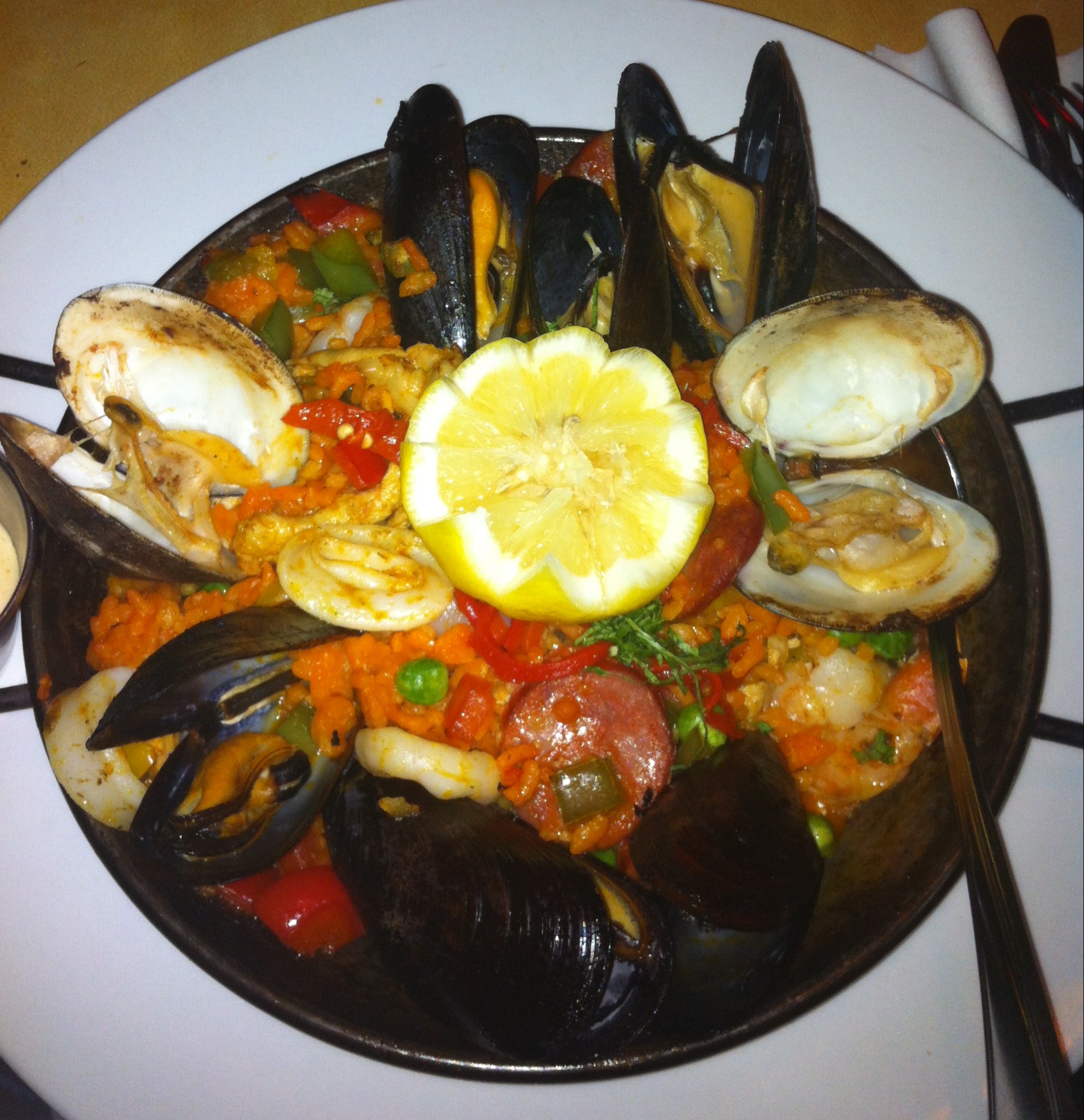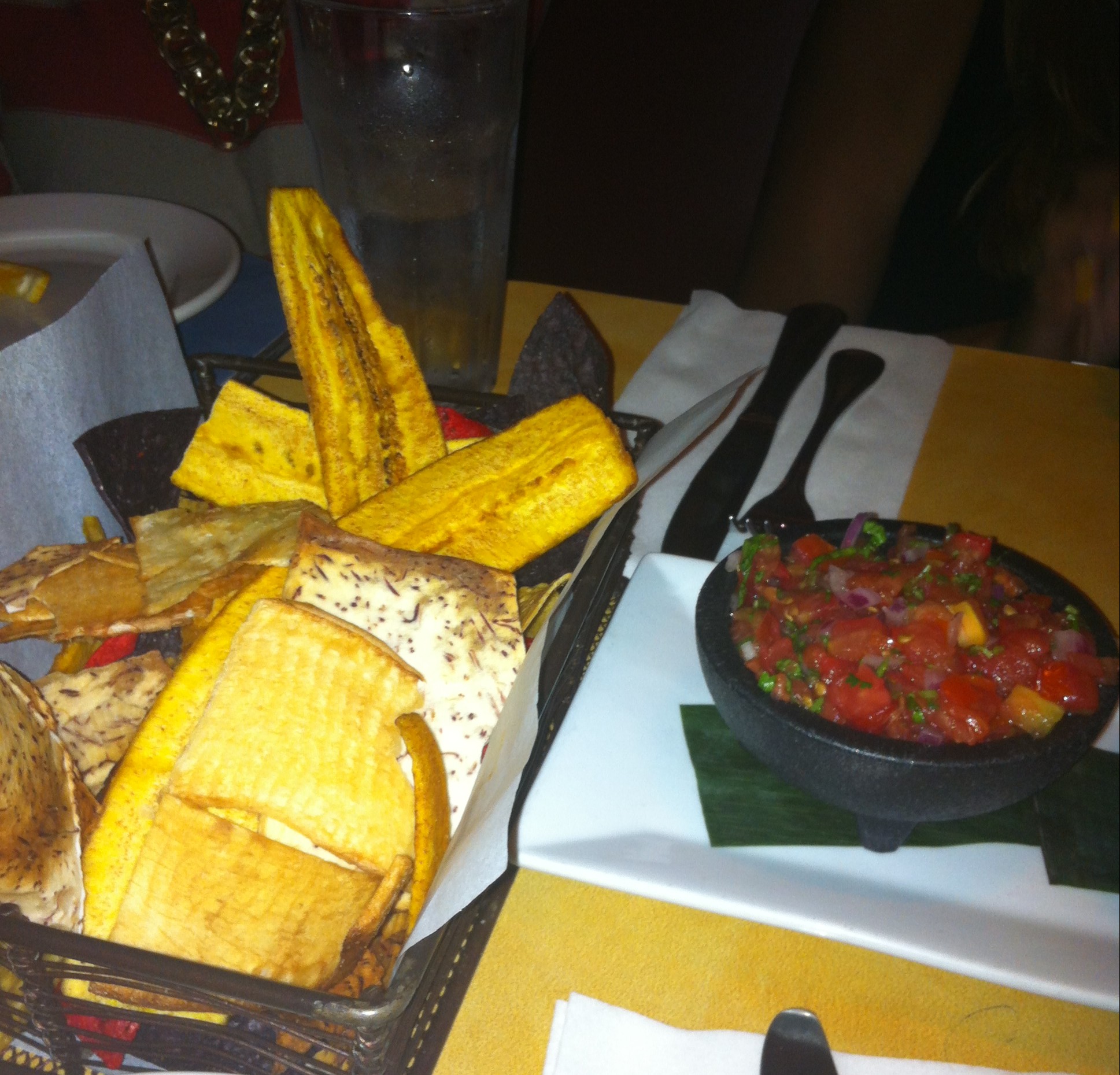 The food was well worth the wait! We started out with a basket filled with a variety of chips (tortilla, plantain, yuca) and also paired with fresh salsa and guacamole. For my entree I chose the paella which was simply delicioso!