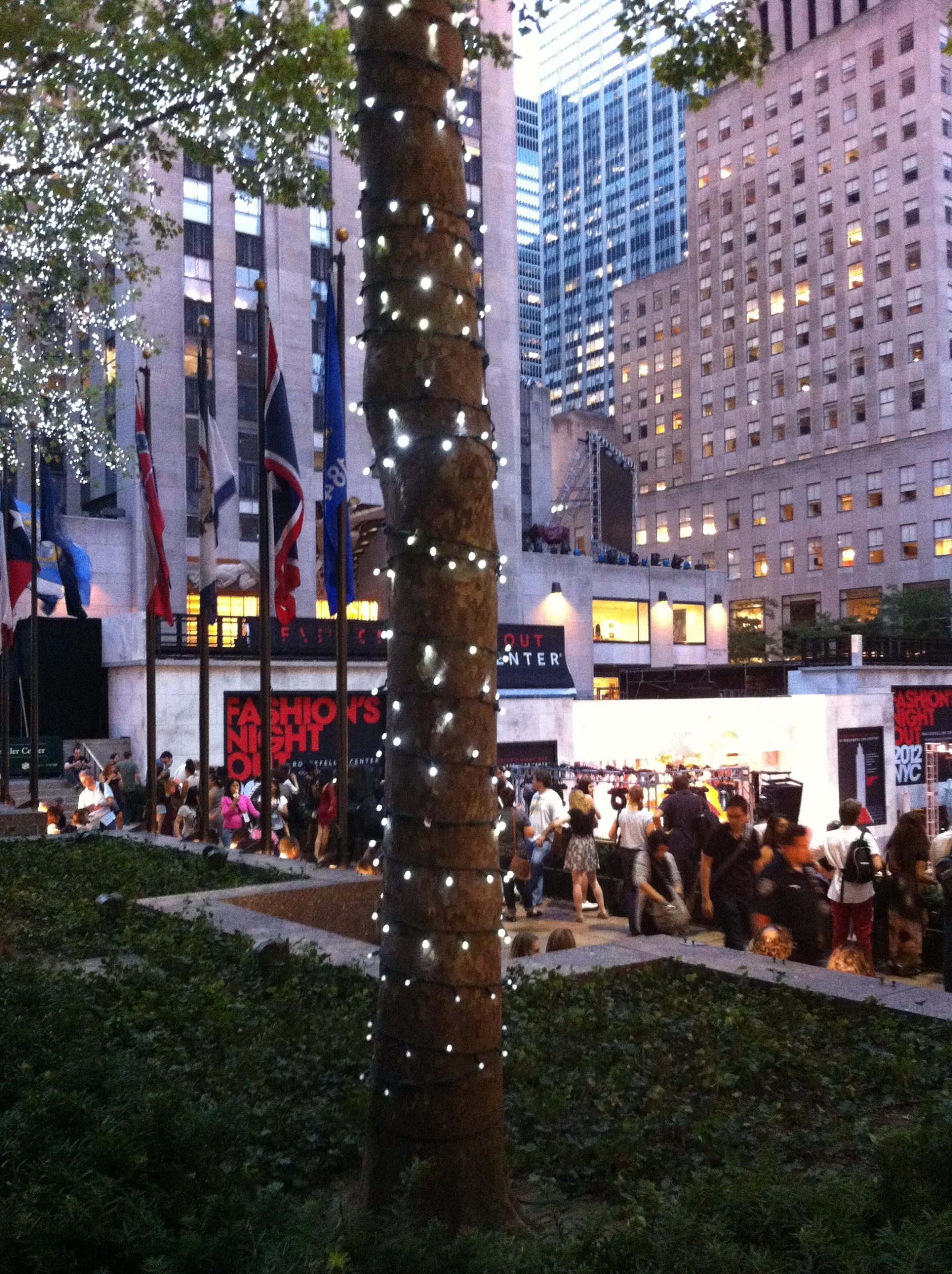 Leaving Saks and heading off Fifth Avenue, things finally quieted down a bit. We passed by Rockfeller Center which was light up and decorated to celebrate Fashion’s Night Out. After taking a quick breather/sit-down at the nearby fountain, we headed downtown to the Socialyte and Bloggers’ Night Out event at Arrojo. While the lovely Liz created a waterfall braided effect with my hair, I sipped on a cocktail provided by Stoli and listened to the live band that was performing.