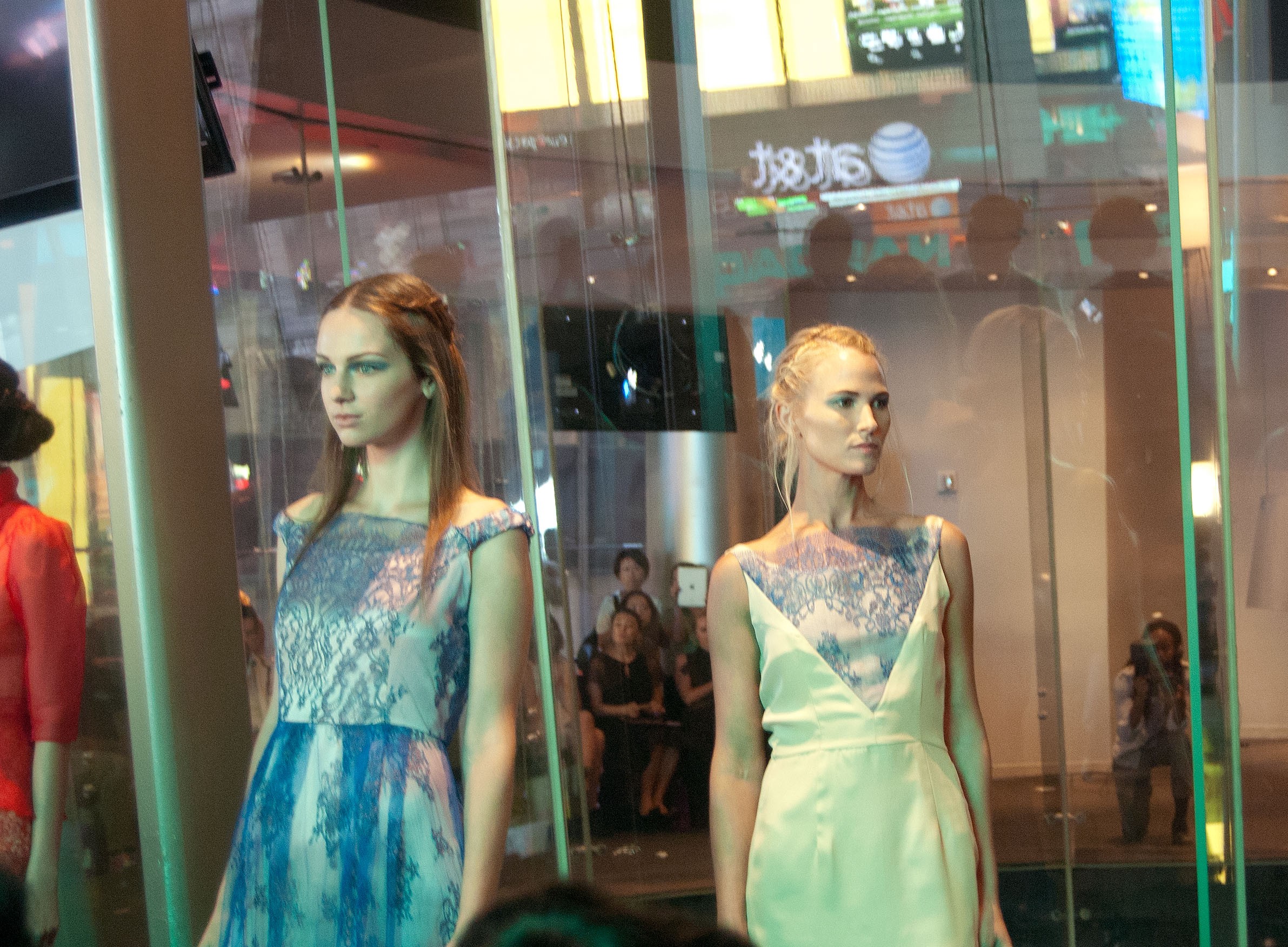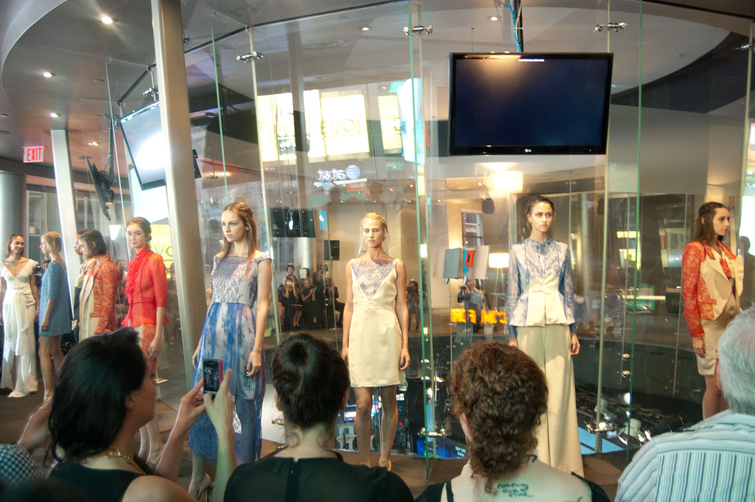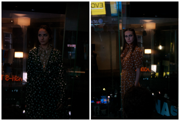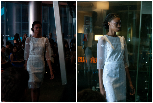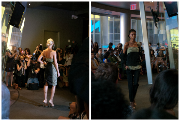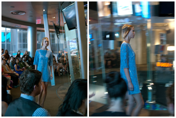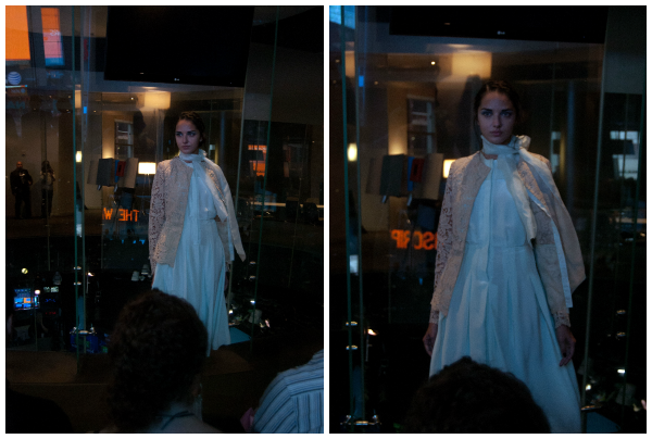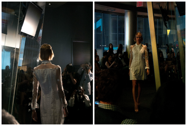 Yuna Yang was the first show that I attended on my own invitation. It was held in the Nasdaq Center in Times Square in a circular room with floor to ceiling glass windows. The presentation started out with a short video piece and then launched into a runway show. Lace was everywhere in this collection in a variety of colors- red, blue, green. There were also several crisp white outfits, as well as a few pieces in a cheerful polka-dot print. Models showed off wispy braids, as well as dramatic eye makeup paired with a neutral lip. My two favorite pieces were both gowns: one in all white with sweet crochet detail along the shoulders and across the back and the other was the red stunner with an open back pictured above.