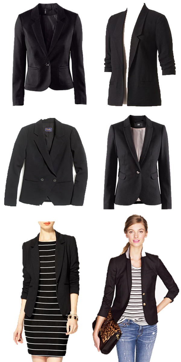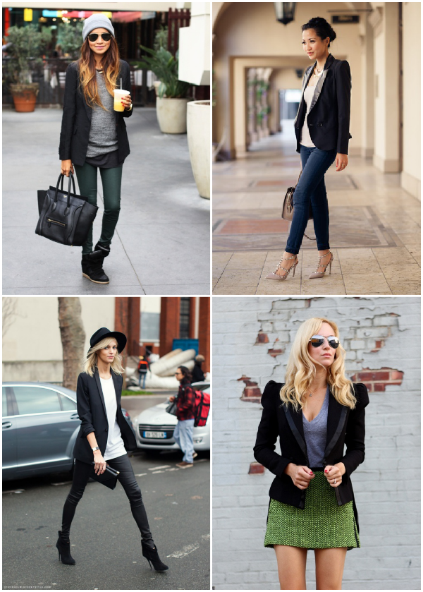 I’m beginning with the basics and first on my list is finding the perfect black blazer. I have a black blazer right now, but the fit is all wrong and I feel that it swallows me up a little bit. However, with the right fit/cut, a blazer is a great way to finish off a casual or dressy outfit. Take a look at some options that have caught my eye above and some inspirational looks below!