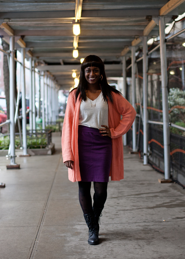 It was a rainy Saturday afternoon, so Alex and I took cover under some scaffolding (there’s always scaffolding somewhere in NYC- buildings are constantly being constructed or renovated). Wearing this coral cardigan is like wearing a blanket- it’s just so cozy! Also, even though these earrings are bigger than what I normally wear, I couldn’t resist matching them to my cardigan.