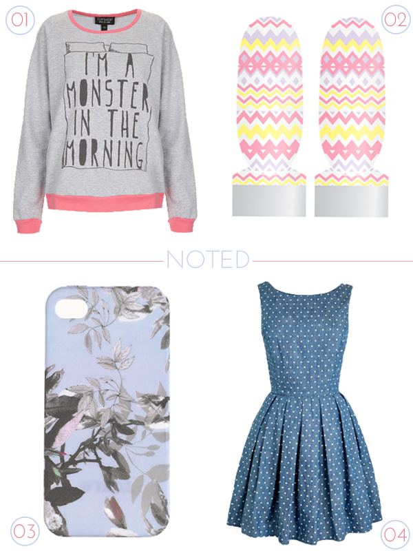 1. Topshop Monster PJ Sweat Top // 2. Incoco Nail Strips- Pretty in Pastel