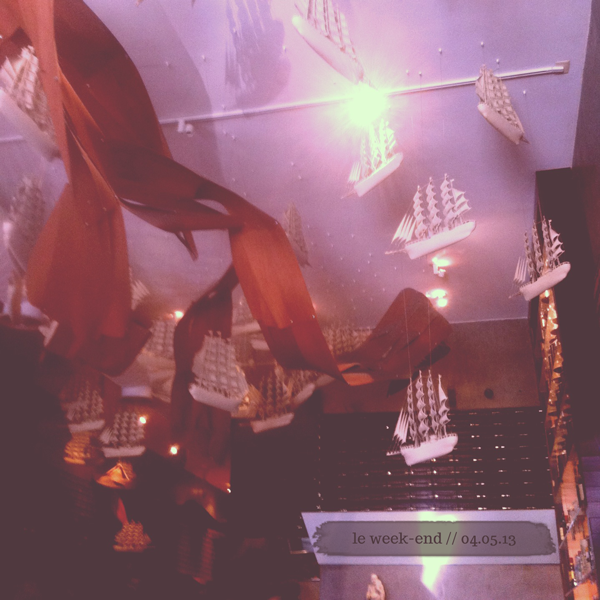 // On Thursday, I took some of my coworkers to one of my favorite places for a cheap and delicious sit-down lunch, Qi (that’s where the picture above was taken). I’ve been to both the Union Square and Time Square locations and I like that they’re decorated differently. The Times Square location is all about white and clear lucite furniture with a little bit of sparkle in the chandeliers, while the Union Square is a lot darker and moodier and has these cool little ships hanging down from the ceiling.